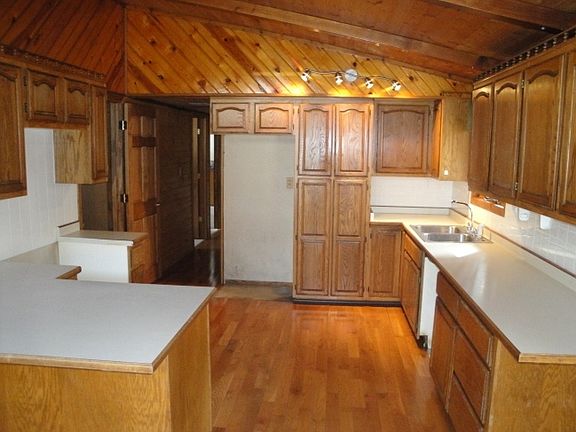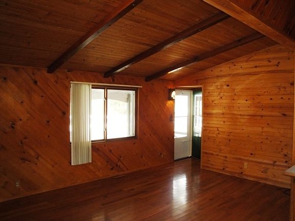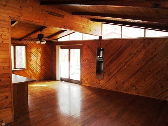 This cedar-sided 3 bedroom 1 bath ranch features open concept living & dining areas & warm wood floors & walls, vaulted ceilings & 6-panel doors. French patio doors lead to a wraparound deck & the kitchen overlooks the back yard. There is a large bath with jetted tub & 2 vanities, a full unfinished basement, newer furnace, carpet, front door & some fixtures. Perfect for someone who wants plenty of garage space, there is a 2+ car & 2 1-car garages, blacktop drive & warranty.