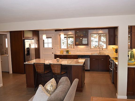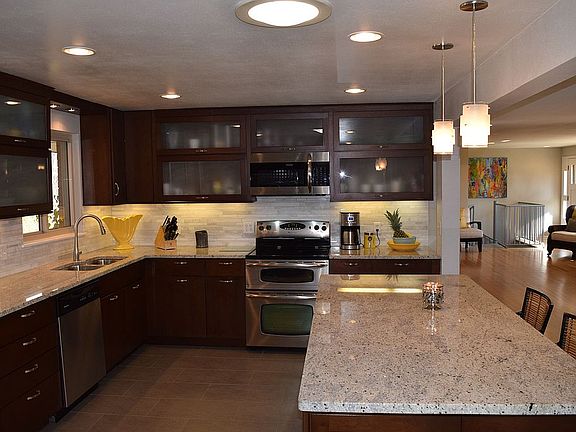 Main Level - This level has an open floor plan. Kitchen and family room have Industrial grade tile floors. The dining room and living room and all bedrooms have hardwood floors. Kitchen has custom contemporary cherry cabinets with under cabinet lighting, granite countertops, stainless steel appliances, double oven stove, huge island with eating area. Easy access from Kitchen through mudroom/laundry to the two car garage with three car driveway. Three bedrooms on main floor, along with fireplace. Two Bathrooms on main level have been remodeled. Master has sandstone tile flooring, concrete sink, marble stone in shower with accent tile. Second bath has tile floor, cast iron tub, quartz countertops, Basement - Also has open floor plan. Basement has Travertine tile flooring except for carpet in the two bedrooms. Five of the seven windows in basement are Large (5 feet long) which allows much light in. Spiral and a standard staircase allow easy access to basement from main level(one is new oak stairs the other is a metal spiral staircase). Bathroom in Basement has also been remodeled. Corner Lot - Faces South East includes an automatic sprinkler system, a covered paver back patio, concrete porch in front, and mature landscape, fenced backyard and three stone columns that accent front yard.