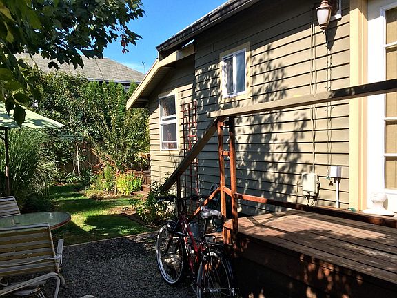Sunny and spacious Portland style-bungalow with wood floors and lots of charm. Clean and well-maintained home. Two lovely bedrooms and an extra office/bonus room with French doors opening to a shady patio. One bath. Open kitchen with view of beautiful lush backyard. Wood floors throughout first floor; carpet in second-floor finished attic, tile in bath. Roomy basement with lots of storage space & laundry area. Private fenced backyard with a shady patio, a sunny deck, mature trees, bamboo, organic gardens designed for bees and hummingbirds & room for vegetable gardening. Central gas heat and central air conditioning (perfect for this hot summer). Well-insulated with double-pane windows. Large dry basement with washer/dryer hookups. Lots of storage space. Dishwasher. Organic gardens Quick drive to Woodstock Hardware, Otto's Sausage Kitchen, Woodstock Library, Red Fox Vintage, Mt Scott Community Center, Arleta Library Café, Goodwill, Delta Café, Toast, Portland Fish Market & several great food carts. Two great Farmers Markets: Woodstock & Lents. New Seasons coming soon. Easy walk or bike ride to bus stop, Green Line Max & the Spring Water Trail. Bike score of 91 - www.walkscore.com.