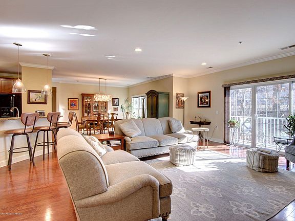 This beautiful light and bright Farnsworth model is the largest model in prestigious Plaza Grande. It is 1808 sq feet with 9 foot ceilings. The home has a fabulous floor plan with crown moulding, hardwood floors in living room,dining room and kitchen. Custom upgrades in kitchen include granite counters & large pantry. Luxurious master bath with shower, soaking tub and double sinks. Complete this picture with lovely patio overlooking serene treed property. Direct entry garage conveniently located across from unit. HOA includes water and sewer. Enjoy all of the amenities in the newly renovated clubhouse. This is a great adult community located near rt 9 & 18. Close to all transportation and shopping.
