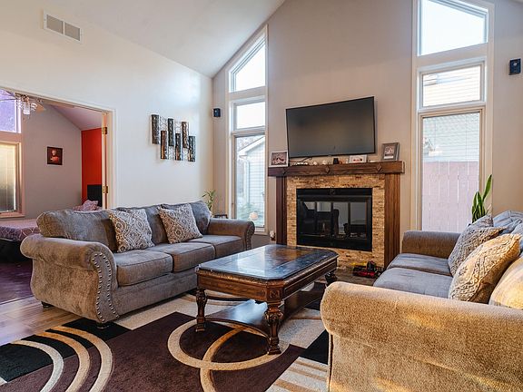 Charismatic multi-peaked front elevation custom built by Star Builders. Gorgeous entry with 6 inch exterior walls, laminate flooring and ceramic throughout. Oversized side entry 2 car garage with new garage door! Well maintained appliances that remain with the home, but not warranted. Cathedral living room ceilings with fireplace and mantel. Master bedroom includes spacious walk-in closet with vaulted ceiling. Both bathrooms have been updated with new vanities and sinks. High efficiency furnace and AC unit only 4 years old. Stamped concrete back patio, perfect for entertaining friends and family. New siding installed this month! You will not want to miss out on this turn key cozy home. Open house has been cancelled