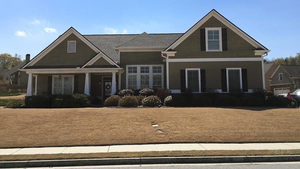 Spacious Craftsman style 1.5 story home with four bedrooms, 3.5 bath. Starting in great room that adjoins formal dining room and 10+ foot coffer ceiling. Great Room also features gas log fireplace and stack stone hearth. Owner suite with trey ceiling and spa bath. Hardwood floors throughout public area. Gourmet kitchen with island, double oven and new microwave plus refrigerator remains. Upgrades also include Plantation shutters and architectural roof. Professionally Landscaped and convenient to i-85, Chateau Elan and Lake Lanier.
