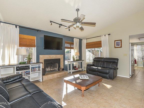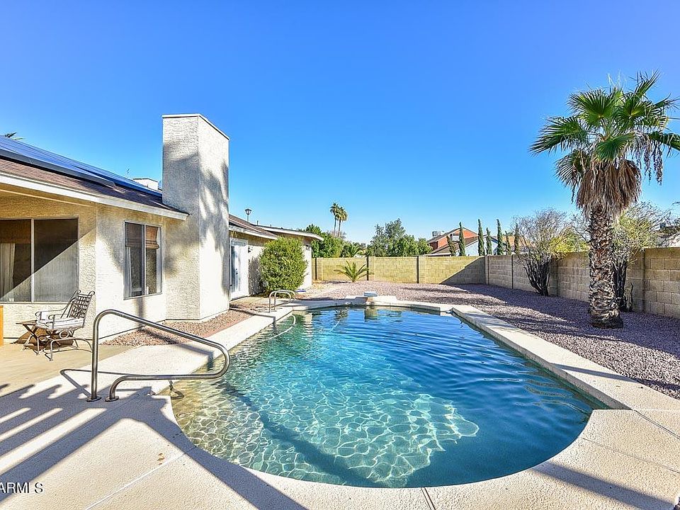 You'll find welcoming curb appeal and a large corner lot and mature trees with plenty of grass for play. This cozy home's entry offers vaulted ceilings and neutral tones with a dining room area adjacent to the family room which boasts a wood burning fireplace. The kitchen is light and bright with medium oak cabinets, formica counters and eat-in breakfast area. Notice the spacious backyard with a covered patio, large diving pool, 2 convenient storage sheds and a fenced dog run. So much space for your creativity to add an extra play area or more entertaining space. Energy saving potential with the owned solar system. Pioneer Elementary is just down the street, Cactus High School around the corner, and shopping and restaurants in the Arrowhead area nearby
