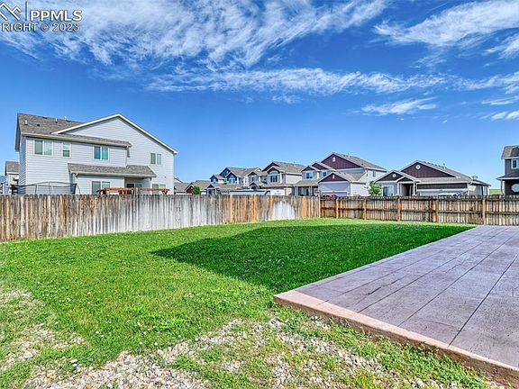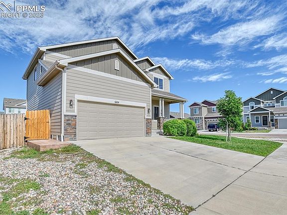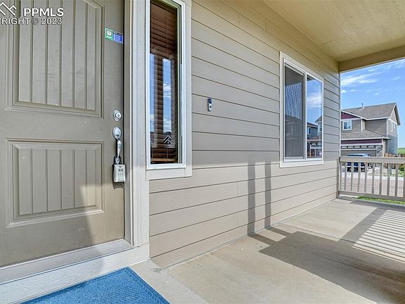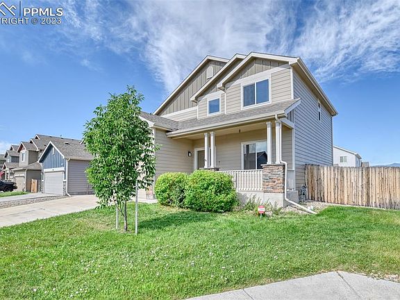 Sparkling clean and move in ready, this 2 story home features 5 bedrooms and 3.5 baths. A spacious 3 car tandem garage completes this home situated on a corner lot. This home also has central air and a humidifier. A covered front porch welcomes you into the main level with gorgeous wood floors throughout the entry, formal dining room and kitchen. Entertaining is easy with the large dining room. The kitchen has ample birch wood 42 inch cabinets, solid granite countertops complete with a breakfast bar/island and pantry. The kitchen comes with a stainless steel appliance suite. The adjoining spacious living room is open to the kitchen and perfect for entertaining and gatherings. Walkout to the gorgeous and updated oversized concrete patio (approximately 10 x 42) and level, fenced backyard with mountain views. Automatic sprinkler systems keep the front and back yards easy to maintain. There is also a built-in concrete ramp the owner added to easily roll the trash canister behind a conveniently located gate to the side of the house. 4 bedrooms are located on the upper level, including a spacious primary bedroom with vaulted ceilings, an adjoining 5 piece bathroom complete with dual vanities, soaking tub and a large walk-in closet. The laundry room is also located on the upper level. Samsung washer and dryer set is included. The basement is finished, and features a large family room, another bedroom (this is #5) and full bathroom. There is extra storage in the basement as well. The owner has recently had the furnace and central air inspected, and the home has been professionally cleaned. No HOA. Convenient to Peterson, Ft Carson and Shriever military bases. Also conveniently located near hiking and trails such as Fountain Creek Regional Park, Bluestem Open Space and Cheyenne Mountain State Park. Easy access to the interstate as well. Once you cross the threshold, you'll know your search is over!