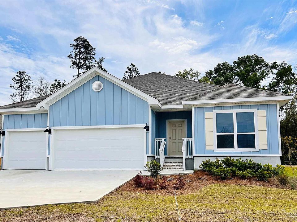 The Destin plan is a beautifully designed 4 bed, 3 bath home with a covered patio and a 3-car garage. This home features a large breakfast nook and separate dining area with a very comfortable open design for easy entertaining. Interior features include stunning granite counter tops in the kitchen and baths, stainless steel appliances, a large island bar and corner pantry. Bedroom 1 is spacious with a walk in closet and adjoining bath that has a double vanity, garden tub and a large separate shower. Beautiful EVP flooring is throughout the home with frieze carpet in the bedrooms. This home comes standard with a Smart Home Technology package which includes a KwikSet keyless entry, Skybell doorbell, automated front porch lighting, an Echo Dot device and a Quolsys touch panel that can control your lighting, thermostat, front door and so much more. A five-minute ride to Interstate I10 puts you minutes from shopping, restaurants, entertainment and Pensacola beach.