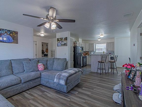2020 3 bedroom 2 bath manufactured home For Sale. This home is located on a home-site with low-maintenance landscaping. It has a shingle roof, eves, and there is a shed at the rear of the home site. This split floor-plan has bedrooms and bathrooms at the front and rear of the home. It has 2 guest bedrooms at the rear of the home, the master bedroom at the front of the home. There is a "great room" in the center of the home that includes the living room, kitchen and dining room. Laminate flooring is installed throughout the entire home and the home has tape & texture drywall as well as 9-foot ceilings. There is also factory overhead lighting in every room. Lighted ceiling fans are installed in the living room, one of the guest bedrooms and the master bedroom. The kitchen is nicely appointed with plenty of upper and lower cabinets, a tall pantry and a convenient breakfast bar. All of the existing major kitchen appliances are included and there is a separate dining area next to the kitchen. The laundry room is located just inside the back door of the home. The existing washer and dryer are also included. The master bedroom is accessed from the living room. This room will easily accommodate a king-size bed The en-suite ,aster bathroom includes a large vanity, a walk-in closet and a large walk-in shower with sliding glass enclosure. This home feels as though it is brand NEW. It has been well maintained and affordably priced.