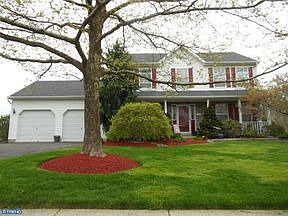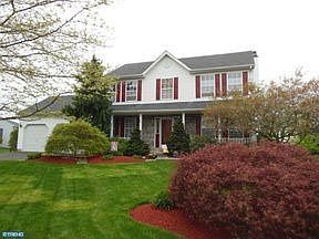 Stone-front 4 BR, 2.5 BA Colonial with front porch available for sale in Plumstead Township's, ''Cabin Run Estates!'' H/W floors, custom moldings, Kitchen/Family Room areas are open in the rear of the home with sliders to patio and rear yard. Stone gas fireplace (also WB) with custom wood mantle and blue stone hearth in Family Room. Kitchen w/ H/W floors, island, tile back splash, SS appliances, pantry, recessed lighting and more. Main Floor laundry. Main bedroom with vaulted ceiling, ceiling fan, walk-in closet and updated private tiled bath with customized double stall shower. 3 more bedrooms with W/W carpeting and ample closet space. Updated hall bath. Professionally landscaped lot with paver wall and walkway to patio. 2 Car Garage. Above ground pool and deck recently removed, grass growing out back! Seller to offer Buyer a $1,000 credit for new countertops. Welcome Home!