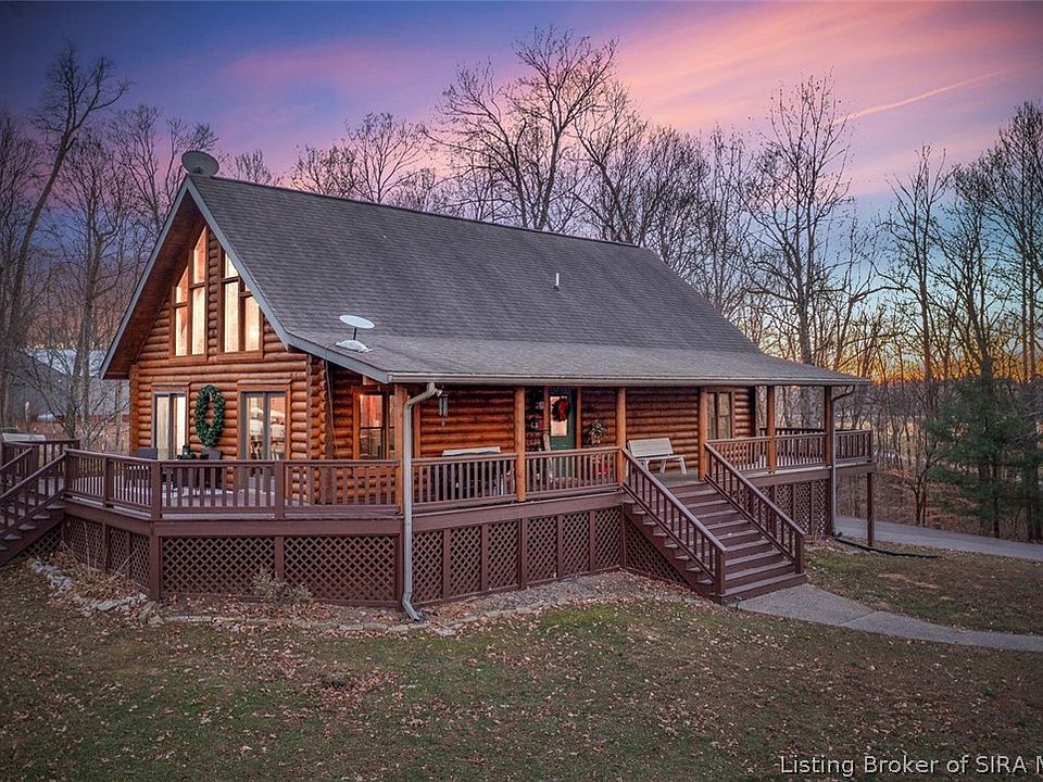 STOP THE CAR! This gorgeous, immaculate log home with wrap around deck has an open floor plan and 3 large bedrooms; one on each floor. Inside, experience the serenity of the gabled windows and their tree top views while surrounded by nature. The kitchen has newly painted cabinets. a breakfast bar and pantry. Large main en-suite has a walk-in closet, full bathroom and additional room, perfect for a nursery, office or hobby room. The laundry room with washer and dryer on the main floor includes a window and door to the back deck. This beautiful home features 2 1/2 baths, each with a new toilet. Half bath and 2nd floor bath have new tile flooring. (3rd bath rough-in in the lower level is almost complete with the shower installed and ready to add your own choice of remaining fixtures). The loft has breathtaking views and the oversized bedroom has a full bath, linen closet and additional knee wall storage. Lower Level walk out also features a newly finished family room, large bedroom, walk-in closet and storage room big enough to store all your extras. Apple, pear and plum trees gift the front yard and elderberry, blueberry, blackberry and raspberries line the backyard garden fence. Detached 2 1/2 car garage can function as a workroom and store your yard equipment.This beauty sits on 2 spectacular acres with panoramic views of nature. Stained and sealed deck, 2021. Landscape creek feature. HVAC 2022. Septic new in 2020. Selling "AS IS" Sq ft & rm sz approx.