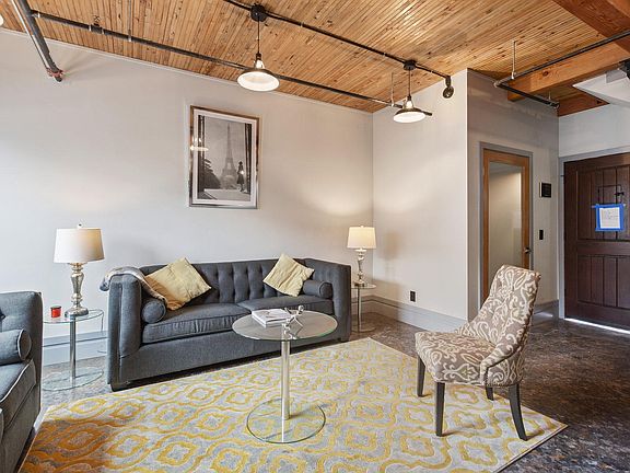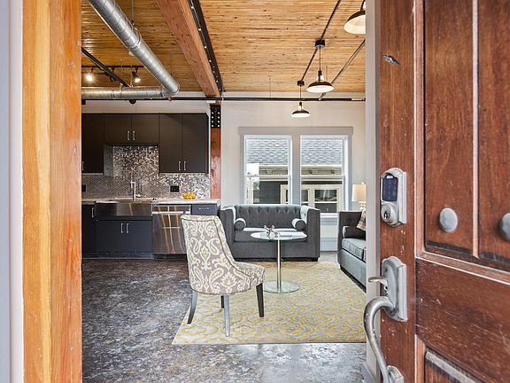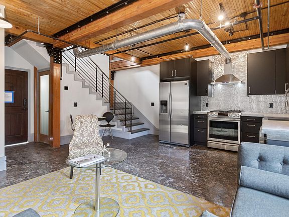 Quality finishes and smart technology take this hip new one-bedroom into something you have never seen before. Reminiscent of an industrial loft conversion, the creative open design is artsy and exciting. Reality spins into awe, as you feel the custom quality of concrete floors with radiant heating and cooling, wood plank ceilings, massive timber columns, and heavy steel hardware. Smart technology quickly takes over with voice activated control of the temperature, lights, music, shower, and more. The kitchen and living area is completely open and interactive, anchored by matte black cabinets, concrete counters, and very smart Samsung appliances. The powder room with beautiful floor to ceiling tile completes the downstairs space. Head up to the bedroom space from a sassy metal tread staircase to the loft like bedroom and in suite bath. Floor to ceiling designer tile, and a large soaking tub.