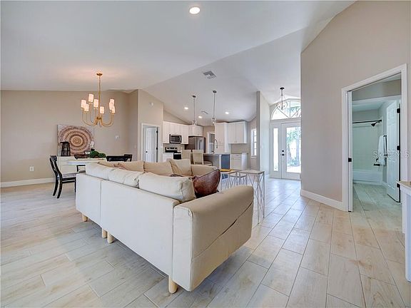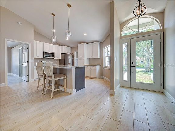 - Interior Features: Ceiling Fans(s), High Ceiling(s), Master Bedroom Downstairs, Open Floorplan, Split Bedroom, Stone Counters, Walk-In Closet(s), Solid Wood Cabinets, Thermostat, Kitchen/Family Room Combo, Living Room/Dining Room Combo, Cathedral Ceiling(s), Vaulted Ceiling(s)