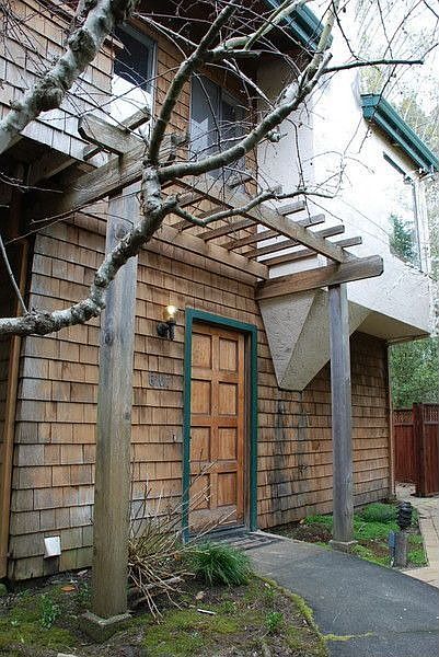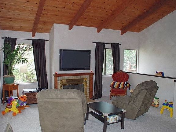 Custom contemporary wall texture at entryway of lower floor leading to 2nd level***Two master suites on ground floor***Master one with sliding glass doors to rear patio, large vanity, shower over tub and walk-in closet***2nd level features vaulted wood beamed ceiling, skylight, living room with wood burning fireplace,window seat near large bay windows w/ green belt views,adjacent dining area***Kitchen has partial upgrade to counters,updated cabinets w/ shaker doors and new hardware***Huge b...