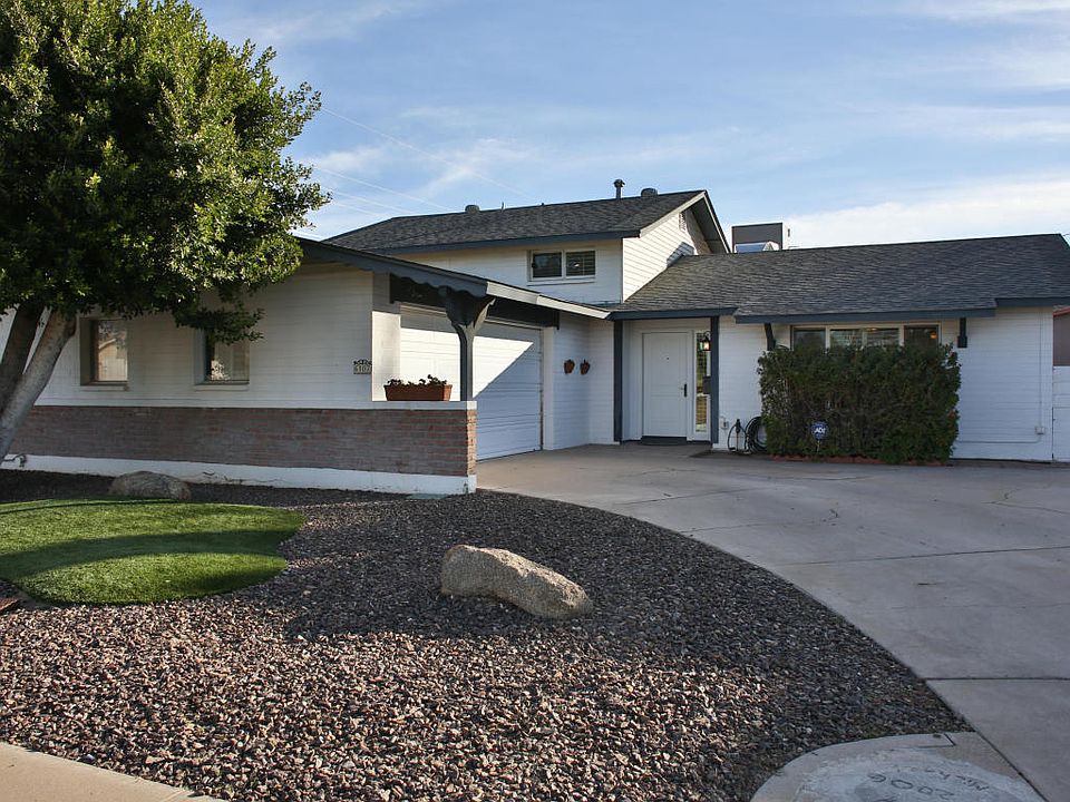 6107 N 87th Pl is a welcoming tri-level house full of that Scottsdale charm you've been seeking. 4 br, 2 baths in a spacious and updated 2,148 sqft. Plush carpet in the 3 upstairs bedrooms. Durable wood and tile floors on the entry level. Alder wood cabinets and quartz countertops in the open kitchen. In the basement you'll find the tumbled travertine, the 4th bedroom with great natural light and laundry room with laundry shoot. Fresh warm neutral paint colors throughout. Wood shutters, dual pain windows, extra insulation, ceiling fans throughout and a new warranted 15 Seer York HVAC unit make the house efficient and comfortable in every season. Low maintenance landscaping in the front and backyard w/ raised & irrigated gardening beds outlining the sparkling pool. This is the one for you