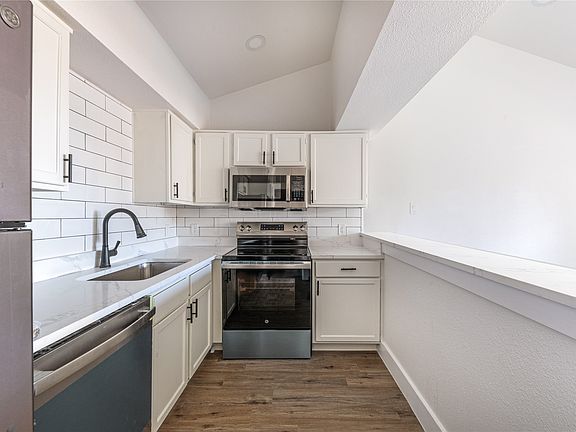 Completely remodeled in fall of 2025. New cabinets, new countertops, new flooring, new white tile backsplashes, new tub and tile shower, new bathroom fixtures, new appliances, new ceiling fans in each room, fresh paint. One walks into a new unit!
