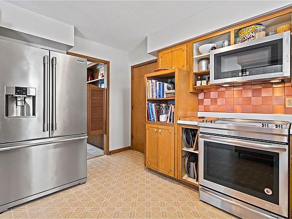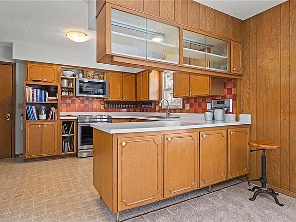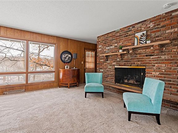 One-of-a-Kind 1961 Mid-Century Modern Ranch. Step into a time capsule of style and charm with this super cool, uniquely designed 1961 mid-century modern ranch, boasting incredible original features that showcase the era’s iconic aesthetic. The striking exterior immediately catches the eye with its unusual roofline, tile roof, distinctive window pattern, and statement-making double front door. Inside, the spacious formal living room welcomes you with wall-to-wall built-in mirrored cabinetry, a stunning focal point that enhances the light and space. Beyond, a second main-level living area and dining space invite relaxation, anchored by a brick fireplace and expansive windows that frame the lush, tree-filled backyard. The kitchen is a true mid-century gem, featuring its original copper tile backsplash and a charming hanging china cabinet. The primary suite is complete with a full bath, walk-in closet, and deck access. The two additional bedrooms are exceptionally large, one boasting dual closets, and while the original cork tile flooring is hidden beneath the carpet, it is believed to extend through most of the main level with exception of the formal living space. Downstairs, the finished walkout lower level provides even more living space, featuring a second brick fireplace, vinyl plank flooring, a fourth bedroom, and a third full bath. Outside, the nature-lover’s dream backyard is surrounded by mature trees and honeysuckle, creating a peaceful oasis where you can relax on the patio and watch birds and deer pass by. Practical upgrades include a 6-inch thick driveway, originally poured to support an RV, complete with a 30 AMP hookup beside the garage as well as new appliances and upgraded windows. This home has been lovingly maintained and is truly a rare find—an architectural gem that blends vintage character with modern comfort. Don’t miss your chance to own a piece of mid-century history!
