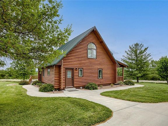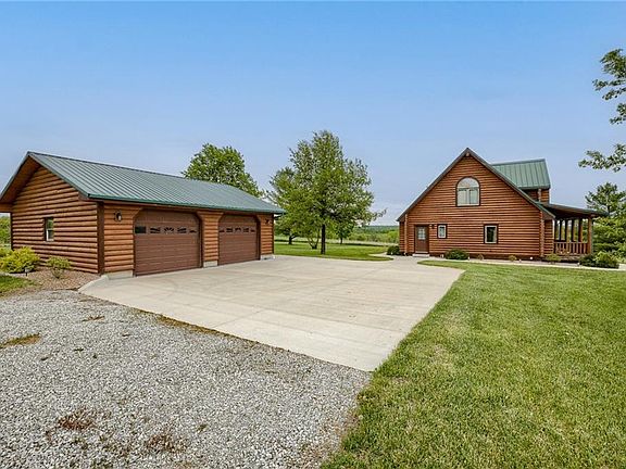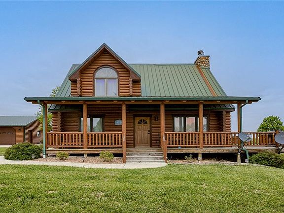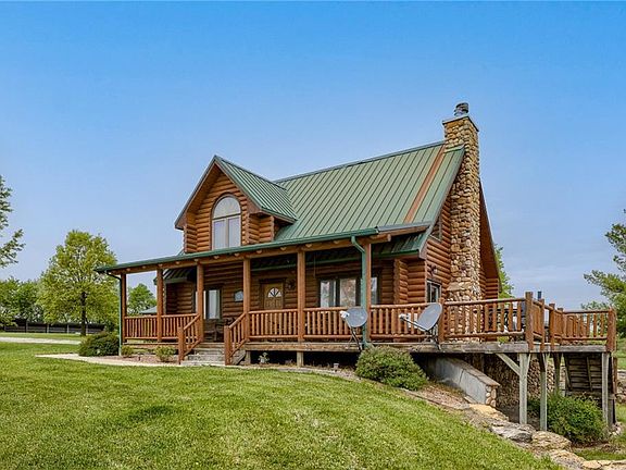 Prepare to have your socks knocked off by this 97-acre picturesque hunting paradise! Tucked away just an hour from the hustle and bustle of Kansas City, this amazing hunting property is a secret oasis waiting to be explored with its food plots, the ultimate in deer stands, trails, mature timber and Grand River frontage, it's a playground for both seasoned hunters and aspiring adventurers. Including 43.17 ac of CRP which expires in 2033/$6,343 annual payment. Minutes from Elam Bend a 1,400 ac Missouri Conservation Area is a rustic and charming 2 bedroom (one a loft and lots of bunk space in the basement) log home and its wrap-around porch with scenic views is the perfect spot to savor your morning coffee or evening cocktail. Boasting beautiful hardwood floors, a vaulted ceiling, a stone wood-burning fireplace, a large loft and open floor plan. The unfinished basement with a full bath and wood-burning stove is the ideal 'bunkroom! The 27'x31' two-car detached garage is more than just a parking spot for your vehicles – it's a hub for entertaining with heat and A/C, making it a great setting for hosting gatherings from lively parties or sharing hunting stories any time of year. And if that's not enough, a 24x24 storage shed and lean-to are ready to store all your equipment and gear. Three ponds, two stocked for fishing. This property can be sold 'turnkey' with an acceptable offer. Create your own storybook chapter in this enchanting and peaceful setting.