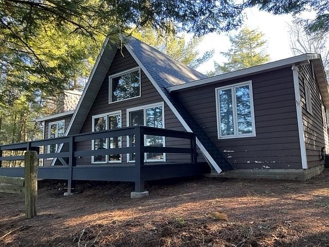 Forest Lake! This classic Northwoods 3 bedroom home is nestled amongst mature Pine trees with 200 feet of sand frontage on crystal clear Forest Lake. This home features Tongue & Groove Knotty Pine and Cedar paneling, a wood burning fieldstone fireplace in the living room, dining room with patio doors leading to the lakeside deck, custom hickory kitchen cabinets, two bedrooms on the main floor plus a loft. Recent 2022 updates include; roof on home & garage, chimney exterior tucked; furnace, back deck, interior paint, electrical updated. Outdoors you'll find a firepit, pier and storage hut as well as a two car garage along with an ATV/golf cart path to the lakefront.