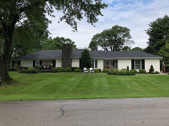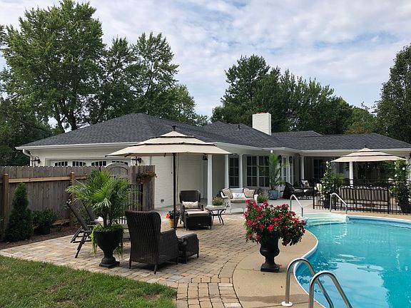 White brick and stone ranch house. Three bedrooms and 2 full/2 half-baths. Major construction in 2018 enlarged the garage, added a laundry and pool bath, and dramatically updated and increased the size of the kitchen. The entire North side of the house is paneled glass floor to ceiling facing private gardens and a pool. Three full fireplace/chimneys with two currently outfitted with gas logs. 2016 stone fireplace and chimney added to the master bedroom which opens to a sunny sitting area and study. High ceilings in both baths and the main family room. Full unfinished basement under most of the house.
