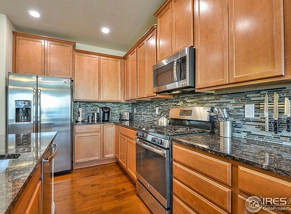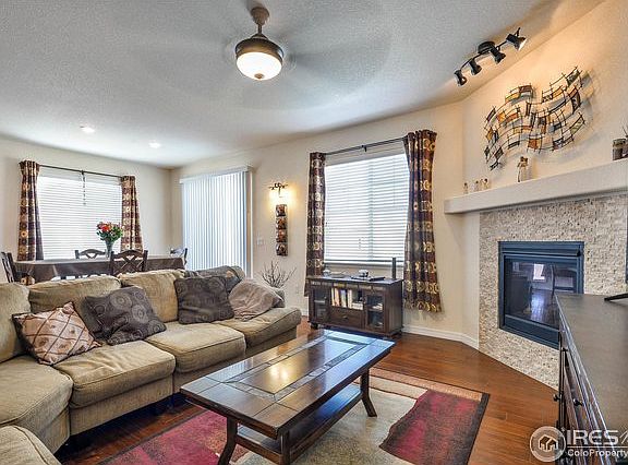 Wonderful newer home in convenient commuter location in Frederick just WEST of I-25. Granite kitchen countertops w/full backsplash, stainless steel appliances, 42 in. cabinetry, undermount sink and island. 9 ft. first floor ceilings, set back thermostat, gas frplc w/tile surround. 2 inch faux wood blinds. 5 pc. mstr bath, lg. walkin master closet. 50 gal. H2O htr. 2x6 exterior walls. Dog door to back area. Front door keypad entry. HERS rated by certified 3rd party rater. Prof. landscaped yard.