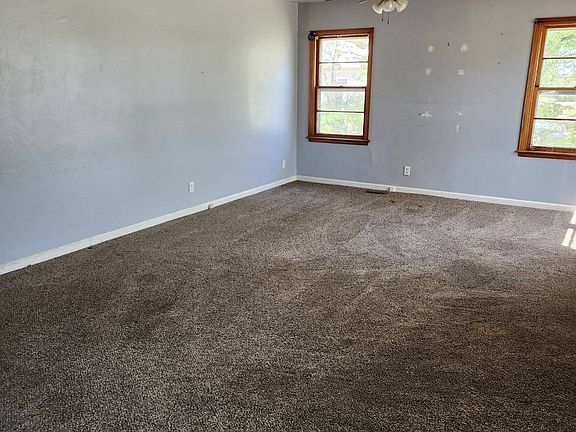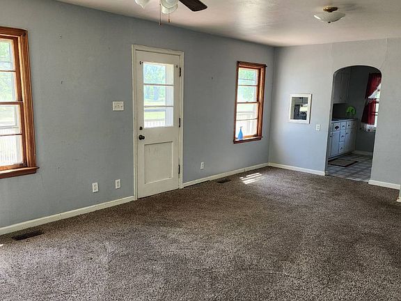 This 2-bedroom, 1-bath home sits on a spacious double corner lot shaded by mature trees, offering both privacy and peaceful living. The home features metal siding, a good roof, and a welcoming front deck with a handicap-accessible ramp. Inside, lots of windows fill the space with natural light. Flooring includes carpeting and vinyl, with hardwood underneath ready to be uncovered if desired. The living room is generously sized, and the full bathroom includes a new tub surround. Additional features include central heat and air, recently serviced with a new breaker and fan on the AC. There is a large unfinished block basement with a sump pump, perfect for storage or future living space. The upstairs is open and ready to be finished for added square footage. Outside, the property includes storm windows, metal siding, a small storage shed, and a detached one-car garage that will need a new roof. This home offers solid bones and plenty of potential, all in a peaceful setting.