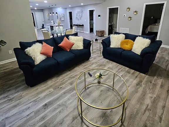 Stylish decorFully-stocked kitchenKing bedQueen bedsCarpet-free floorsSecluded backyardStandard-size crib