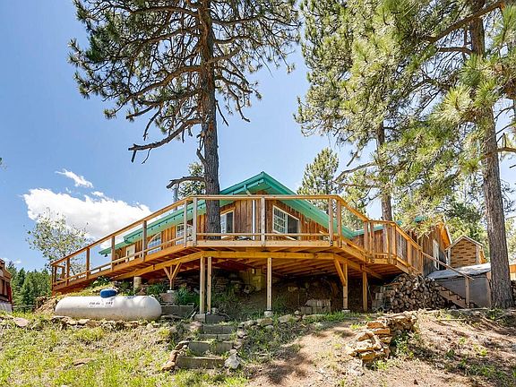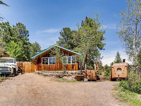 Amazing and rare downtown views direct from the wrap around deck. Affordable mountain living still so close to Denver and shopping. This remodeled charming cabin features a large kitchen, newer appliances that all stay including washer/dryer, a dining room area, family room area and even flex space. The open floorplan showcases the light, views and lush green surroundings. 2 bedrooms with good sized closets and 1 large full bath. Additional amenities include: newer windows, hot water heater, pressure tank and gorgeous hardwood flooring. The gazebo with new hottub stays (this is one of the sellers favorite spots). Xtra deep 2 car attached garage w storage. Tiered lot with great potential for play areas, gardens or for animals. Great surroundings, easy access to amenities and good snow removal by the county.