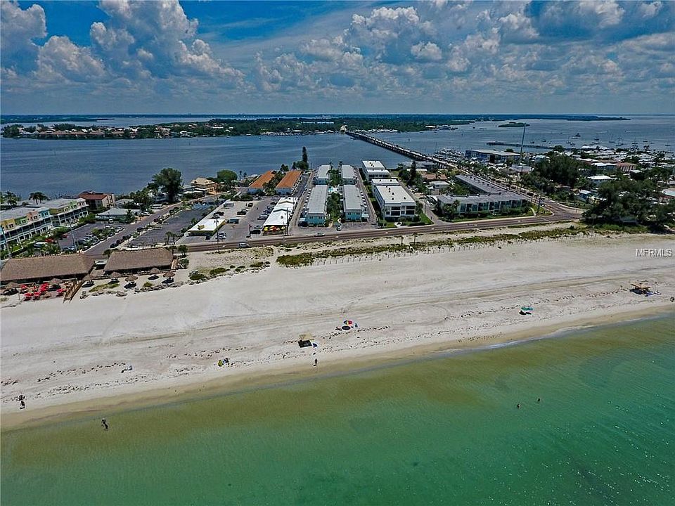 Perfect Island winter home or get away (also great winter or annual rental). Updated ground floor 2 bedroom/1 bath condo at Imperial House of Bradenton Beach. This is a true gulf to bay community. Association owns property on beach side so nothing should ever be built there, a clubhouse and heated pool in the center of complex and bayfront patio and fishing pier on the bay. This condo has a completely renovated kitchen, with wall removed and an island/breakfast bar added that opens to the dining room & living room. Completely repainted, removed popcorn ceilings in living area, added ceiling fans, 6-panel doors, new trim in living room. Windows have been replaced. This is a very social community. You will feel instantly welcomed. Plus close to restaurants & all the amenities of Bridge Street. Come join the fun! Roofs are being completely replaced. Assessments all paid. If you are looking for a great place to enjoy all the island has to offer, this is it! A 55 Plus community where younger people are welcomed 3 weeks at a time.