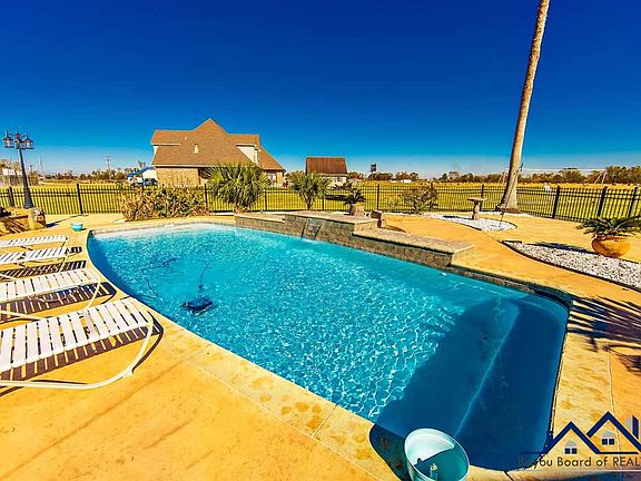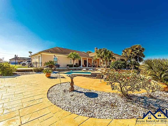 3 bedroom plus bonus room can convert to 4th bedroom. Gorgeous home on 2.5 acres with inground pool which provides a place for sunshine on the lower deck or enjoy shade on the upper deck surrounding the pool. Grab a glass of wine and enjoy the gorgeous full grown palm trees surrounding the beautiful pool side. At night enjoy the pool side lights glistening across the blue water. You will feel like you are in the Mediterranean on a vacation! Wonderful view of the pool from the master bedroom as well as kitchen and den. Quite an inviting home for entertaining. Gorgeous stocked pond in the front of the home. During inclement weather you can cuddle next to the fireplace in the parlor which faces the gorgeous pool as well. Features 10 and 12 foot ceilings. Elongated windows from floor to ceiling provide a cozy atmosphere. Kitchen features a gas stove which is positioned where you can cook and have a perfect view the pool as well! Never miss a beat! Huge master bedroom with fantastic master bathroom suite featuring a large 6 ft jacuzzi tub and a separate double head custom shower. A wonderful home for raising a family and entertaining. Over 2600 sq ft living. This treasure is one that is hard to find. Take a peek. You won't be disappointed! Located just 5 miles from the interstate. Only 40 minutes to New Orleans, 20 minutes to Thiboaux and 17 minutes to Houma. Great central location! Buyer to verify measurements and flood zone.