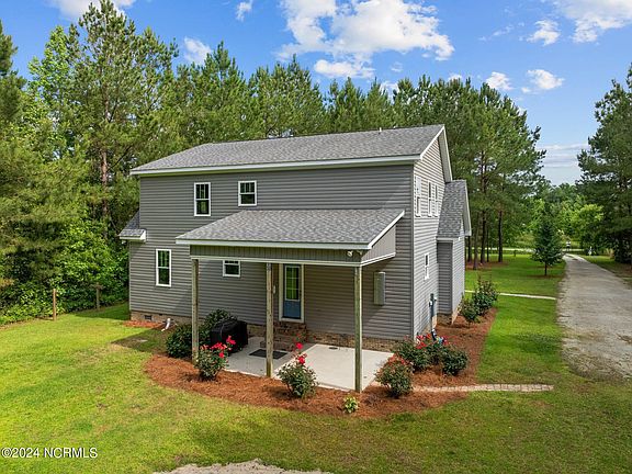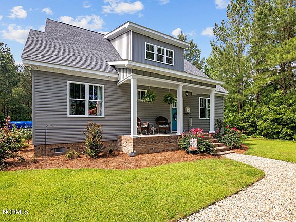 Welcome to this charming modern farmhouse nestled among the trees on a private 2.55-acre lot. This serene property offers the perfect blend of tranquility and modern living. This home features 3 bedrooms with a flexible room that could easily serve as a fourth bedroom, providing ample space for your family's needs. Additionally, the walk-in attic space presents an opportunity for expansion, allowing for the creation of another room or storage area. The primary bedroom on the first floor boasts a luxurious en-suite with a walk-in shower, soaker tub, and dual vanities. The open-concept living area is perfect for entertaining guests or enjoying cozy nights in by the gas logs. Step outside and unwind on the rocking chair front porch, or host gatherings on the back patio, offering a seamless transition between indoor and outdoor living. The split floor plan provides privacy and convenience, while the abundance of natural light creates a warm and inviting atmosphere. With LVP flooring throughout the main living areas, this home exudes modern elegance and easy maintenance. Embrace the peaceful surroundings and modern amenities of this stunning farmhouse, offering a perfect blend of comfort and style for your everyday living. Don't wait schedule your showings now!