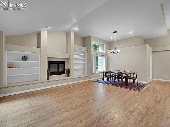 **Gorgeous property located at the end of a cul-de-sac in the prestigious and highly sought-after Highland Terrace community of Colorado Springs** This single-family ranch home offers main-level living, amazing privacy, and a sophisticated and luxurious living experience, with attention to detail and high-quality craftsmanship throughout. The main level features hardwood flooring, high ceilings, and an open feel. The focal point of the living room is a gas fireplace with built-in shelving on both sides and a walk-out to the huge oversized back deck. The setting is quiet and park-like with huge trees and complete privacy. The dining area is open to the living room, featuring a large chandelier and ample natural light creating the perfect ambiance for formal dinner parties and entertaining. The kitchen is extra large, boasting a gas fireplace, white cabinetry and appliances, quartz countertops, and a large pantry. There is also a generous area for a casual dining table in front of the fireplace, providing a warm and inviting atmosphere for both casual dinners at home and entertaining a small group. The primary bedroom is a true retreat, featuring hardwood floors, a vaulted ceiling, and a walk-out to the deck providing a serene and peaceful sanctuary. The en-suite bathroom has dual vanities, a large soaking tub, and a walk-in shower. Also on the main level is a large room with built-in shelving perfect for an office or TV room. The lower level has a big family room with a walkout to the covered patio. You will be captivated by the serene backdrop outside which is perfect for enjoying the Colorado lifestyle. Also on this level are two large bedrooms, a full bathroom, and a huge area for storage. This home has beautiful curb appeal with meticulously maintained landscaping, an elegant stucco exterior, and newer roofs. Enjoy a peaceful and upscale vibe, with easy access to shopping, restaurants, Quail Lake Park, trails, World Arena, the Broadmoor Hotel, and Fort Carson.