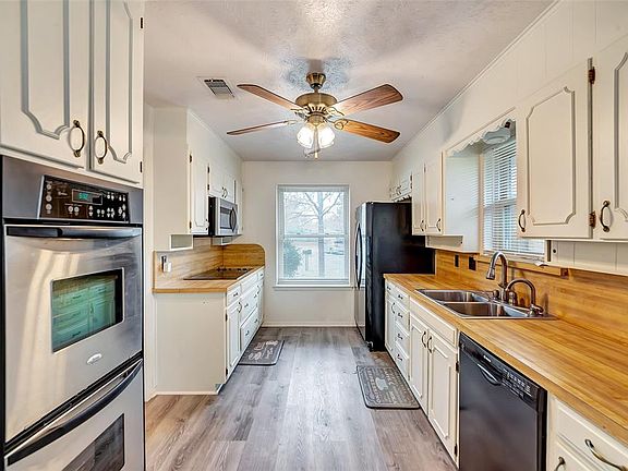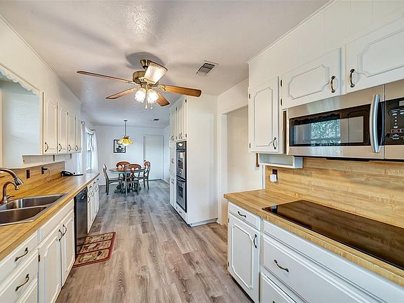 Ranch style home on oversized lot with 4 bedrooms and 2 separate backyards for endless possibilities! Ramp added in lieu of front porch steps for wheelchair accessibility and 1 bathroom has been modified to be wheelchair accessible (shower and sink.) Galley kitchen with tons of storage space, double ovens, white cabinets, and breakfast area. Huge living room with a vaulted ceiling, exposed beams, and a beautiful brick fireplace. The large backyard has an open patio and privacy fence. The home has newer windows, large closets, and located .6 miles from Allen High School!