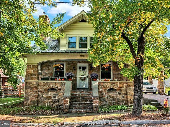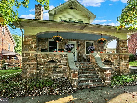 From the solid natural stone to the welcoming front porch to the deep windowsills and attached stone carport, this home is reminiscent of days gone by yet offers all the modern conveniences including central air conditioning. The living room and formal dining room offer hardwood flooring, and the living room has a natural stone fireplace with pellet stove insert. The kitchen has all the amenities you need including a dishwasher and pantry closet. The main floor is complemented by a first floor bedroom which is currently used as an office and an updated half bath. The second floor offers 3 bedrooms with hardwood flooring and spacious closets, including a cedar closet, and a full bathroom with a dual sink vanity and tub/shower combo. On this level, you can also access the walkup, floored attic. The basement provides for laundry facilities, storage, and room to workout or finish into additional living space. Let's step outside where you can enjoy your spacious, fenced in backyard, dining or relaxing under the pavilion, or tinkering in your detached garage which has a wood stove and electric garage door opener. The carport has a side entry into the home. The heat has been updated from oil to an efficient heat pump, and the roof was installed in approximately 2017.