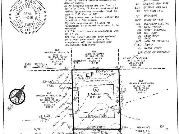 .11 acre vacant lot, 2nd row with unobstructed ocean views. Public beach access is across the street! Survey in hand and perks for a 5/6 bed & 3/4 bath, 3 story home. Water and sewer taps have been paid. Spacious decks on each story allowed for gorgeous views of the ocean, ICW, and island. Minutes to shopping and dining on Topsail Island. Located in Federal Flood zone, your able to get preferred rates.