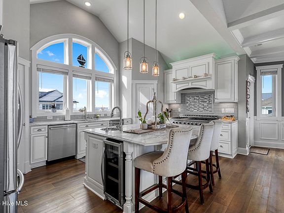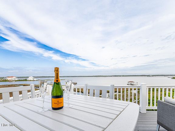 Never been rented! Beautiful fully furnished ICW front beach house in a low risk flood zone with Sweeping Oceanside views of Topsail Island and Alligator Bay. This 1.3 acre 5-bedroom 6 bath home is located on North Topsail Beach close to great shopping, restaurants, and a short drive to historic Wilmington. This home was custom designed with too many features to count and has been meticulously cared for! Over 3300 sq ft, this home welcomes you with white pillar covered porches and an incredible stone face rarely found on island homes! Exterior features include a NEW custom metal roof, high quality vinyl siding with white composite trim, white vinyl handrails, all composite deck boards, hurricane rated windows throughout, a custom outdoor shower, Astro-turf landscaping, an oversized hot-tub, and an incredible custom built tiki bar. Cathedral ceilings rise over the great room and 3rd level, anchored by a grand fireplace custom designed with a tile hearth and mantel overlooking two large couches and two matching leather recliners. Features include transom windows, built-ins, high quality sliding glass doors, large gable windows, 3 stop elevator, and this open floor plan provides the perfect setting to entertain your guests with views of the water from any seat.