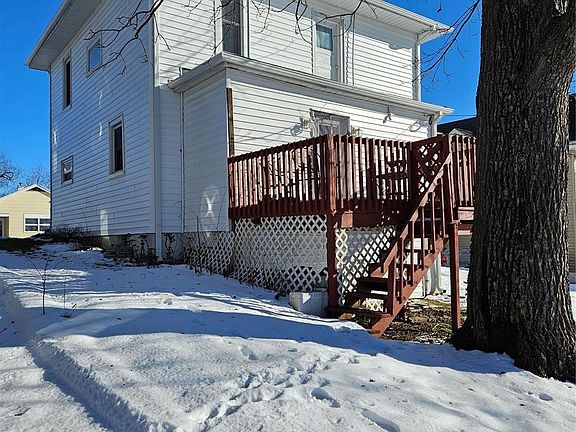 The beautiful staircase accessible from living room & kitchen, the gorgeous hardwood floors, the pocket doors, & the built-in China cabinet are examples of why this home is special! Multi-tasking in the kitchen is easy since laundry area is there, too. (Stackable washer & dryer included.) Abundance of kitchen cabinets plus a pantry. Living room, kitchen, dining room & full bath on main level. Upstairs has 3 spacious bedrooms & 2nd full bath. Covered porch in front of home & tree-shaded deck just out back door. Full unfinished basement with walk-out under deck. New roof & much of vinyl siding replaced after '22 hailstorm. Off-street parking. A comfortable "Home Sweet Home" offering the original charm of 1930 along with many updates we all want!