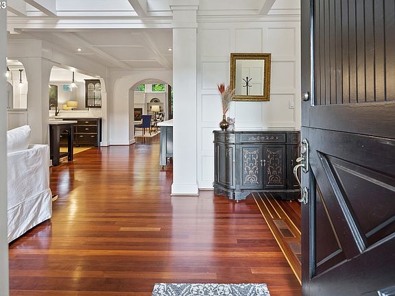 Welcome home the moment you step inside this stunning European Country Farmhouse with handcrafted woodwork and elegant finishes that bring an overall sense of timelessness. Located on the coveted Peninsula of Lake Oswego's quiet Lakewood neighborhood, you'll enjoy everything this friendly community offers, including nearby water recreation, parks, arts, shopping and more. Designed with thoughtful attention to detail, floor to ceiling wainscoting, decorative exposed ceiling beams, mahogany hardwood floors, custom kitchen cabinetry, upscale built-in appliances, Viking gas range, and honed concrete countertops -- including two matching mobile countertops ideal for entertaining. The 3-level open floor plan offers both formal and casual living spaces, both main and upper level primary bedrooms. The main level primary features an upscale ensuite bathroom, including a lavish claw foot soaking tub. The upper floor features two grand bedrooms, both ensuites and both with vaulted ceilings. The lower floor is a great space for family, game room, or even potential ADU with kitchen, storage and laundry room. Escape outside through 10ft double doors onto the main level deck overlooking a private courtyard, flagstone patio, built-in firepit, gorgeous water feature. Add the 3 lake easements and award-winning Lake Oswego schools, this home is a must see!