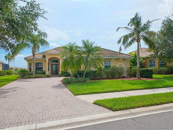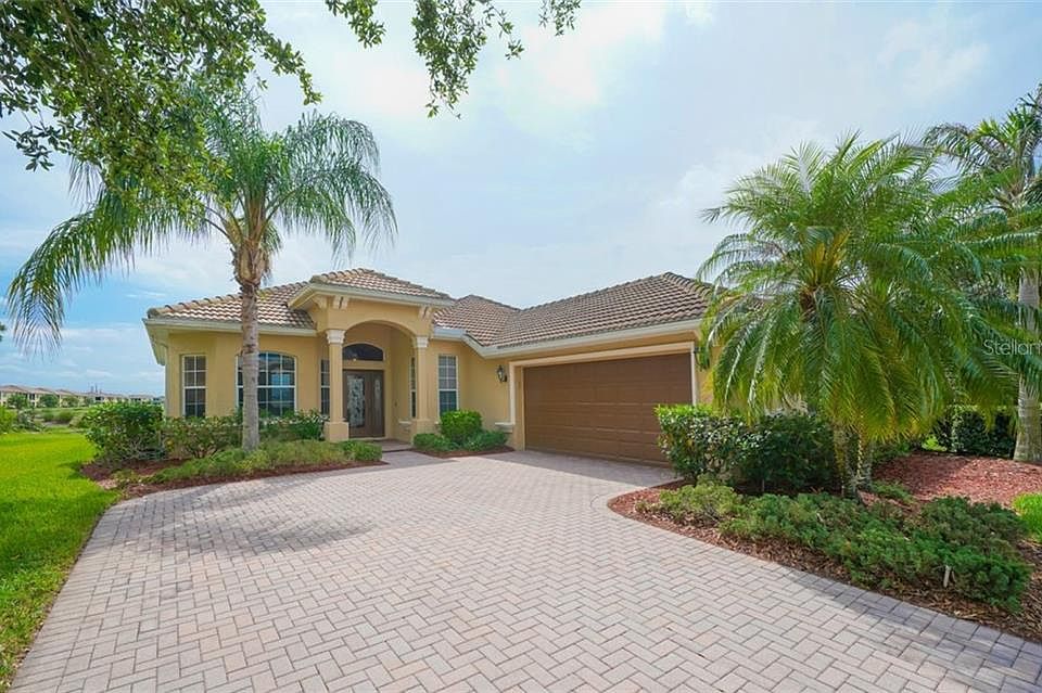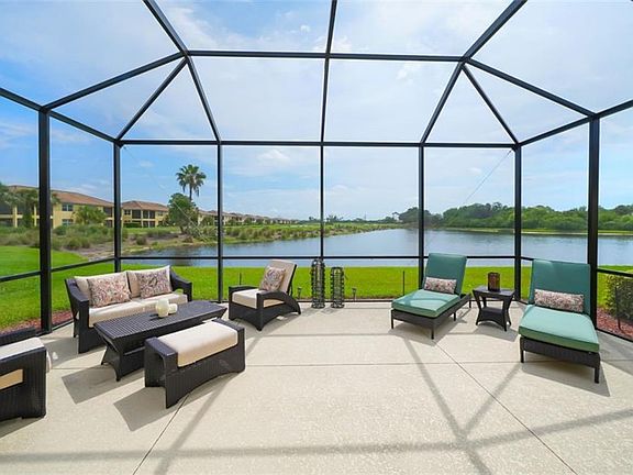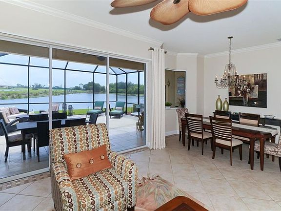 Fabulous water & golf course views and a bright & open floor plan make this home perfect for your Florida lifestyle! GOLF and Country Club membership is INCLUDED to River Strand Golf & Country Club and allows you to enjoy multi-million dollar amenities! The home's Tuscan inspired exterior has great curb appeal with side-entry garage, brick pavers and tile roof. From the moment you enter the front door, the view through the aquarium window and triple sliding patio doors is breathtaking! The home features an open, Great Room floor plan with 2 bedrooms plus a large den which could be used as a home office or 3rd bedroom when needed. An oversized screened lanai with tiled patio area offers plenty of room to entertain or just relax with amazing views of water, wildlife and golf activity throughout the day. The interior features 18" floor tile set on the diagonal flowing throughout the living areas with hardwood in the den. The expansive kitchen has upgraded granite counters, stainless steel appliances, lots of hardwood cabinets and a separate eat-in area. A pass-through with breakfast bar opens the kitchen to the dining and great rooms. The master bedroom retreat offers gorgeous views, access to the lanai and a huge walk-in closet with built-ins. The master bath has dual vanities, a soaking tub, walk-in shower and private water closet. Additional home upgrades and features include crown moulding, tray ceiling and pre-wiring for surround sound. River Strand Golf & Country Club is more than a place to call home--it's an upgraded lifestyle experience. You are always on vacation when you take advantage of the top of the line amenities which include a 27-hole Arthur Hills designed course, 8 Har Tru tennis courts, pickleball courts, Clubhouse with restaurant and social events, two resort style pools with hot tub and resistance pool, 6 satellite pools, two 24-hr fitness centers and more. This active lifestyle, luxury gated community also includes lawn maintenance, irrigation and cable/internet. Convenient location allows for easy access to I-75, shopping, restaurants and award-winning beaches. Furniture available. Call today for your private showing!