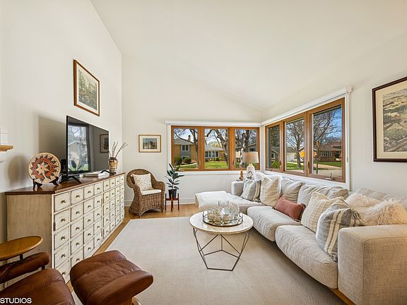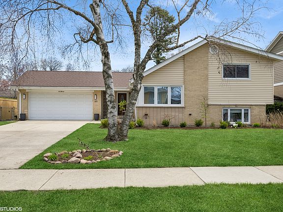 Welcome to this beautifully reimagined split-level home, nestled in the heart of the highly sought-after Lions Park neighborhood-where style, comfort, and an unbeatable location come together effortlessly. Step inside to a truly stunning, bright, and open floor plan that seamlessly connects the spacious living room-with its soaring vaulted ceilings-to the dining area and show-stopping kitchen. Thoughtfully designed as the heart of the home, the newly renovated kitchen is both stylish and functional, perfect for everything from everyday meals to unforgettable gatherings. Enjoy brand new cabinetry, sleek quartz countertops, stainless steel appliances, elegant lighting, and tasteful hardware-all curated for modern living. Natural light pours into the main living spaces through oversized windows outfitted with custom remote-controlled blinds. Brand-new white oak hardwood floors flow beautifully throughout the main level, creating a warm, cohesive ambiance that instantly feels like home. Upstairs, refinished hardwood floors lead the way to a serene primary bedroom and two additional bedrooms that share a full bathroom. The lower level offers even more versatile living space with a cozy family room featuring tile flooring, a gas fireplace with stone surround, corner windows for added sunlight, and a second full bathroom. A generous utility room with exterior access adds ease to your daily routine. Outside, the backyard is a private, fully fenced oasis-lush, serene, and ideal for summer entertaining. The large patio provides plenty of room for dining and lounging under the stars. This home has been meticulously updated from top to bottom: new white oak hardwood floors on the main level, refinished hardwood upstairs, newer roof, newer HVAC (under 5 years old), new GE washer and dryer, upgraded 100+ amp electrical panel, new sliding patio door, freshly painted interior, and updated millwork. A large concrete driveway leads to an attached 2-car garage, offering ample storage and everyday convenience. Located within the top-rated Lions Park, Lincoln Middle, and Prospect High School districts-and just steps from parks, Big Surf wave pool, community concerts, and all the dining, shopping, and charm that downtown Mount Prospect has to offer. Welcome home!