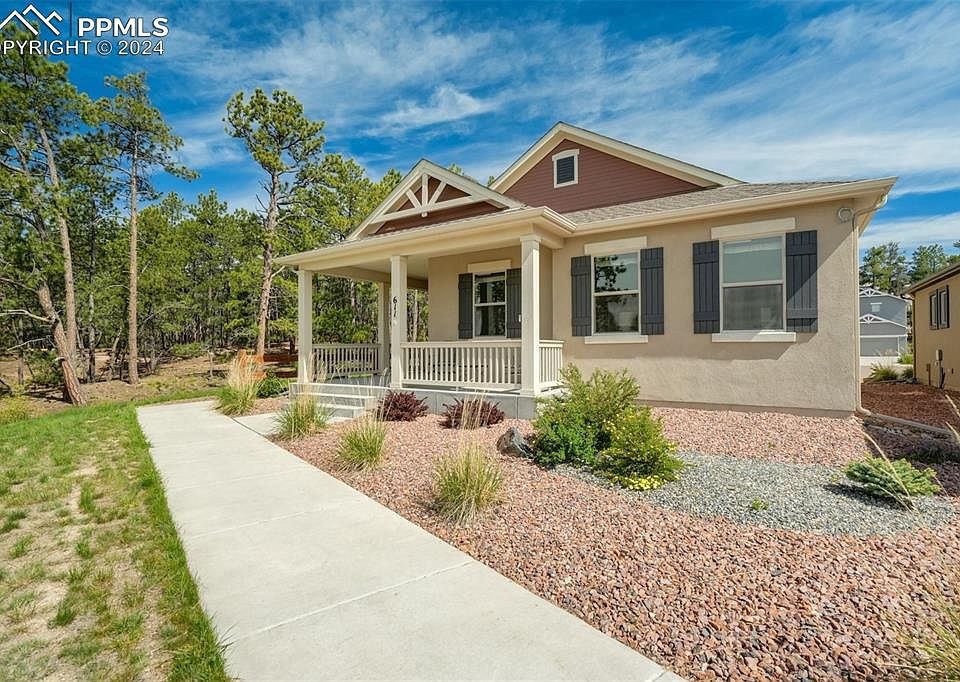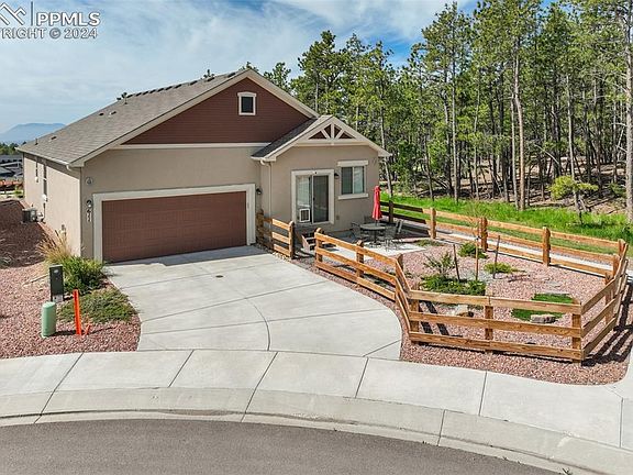Don't miss your opportunity to reside in the sought-after Sanctuary Pointe neighborhood at half the average sales price! This single-owner home rests atop a hill, embraced by ponderosa pines, and offering spectacular views of the front range. If you seek a convenient and luxurious lifestyle, your search ends here. This residence includes wood laminate flooring throughout, crown molding, hand-troweled texture, Hunter Douglas Duolite Shades w/ PowerView Automation, premium Whirlpool stainless steel appliances, granite countertops, a stone fireplace w/ custom mantel and Heat-N-Glo insert, Samsung TVs, and Smart Home features such as smart door locks, smart garage door, Nest thermostat, video doorbell, Amazon Echo Show, and more! Outside, discover a low-maintenance yard, a 50-year composite shingle roof, and a durable stucco exterior. Revel in the stunning Colorado sunsets from your expansive covered front porch or unwind on the back patio beneath towering ponderosas. Upon entry, experience a thoughtfully designed interior offering convenient single-level living. The large Master Suite at the front of the house features a sitting area, Front Range views, walk-in closet, and an ensuite bathroom. Additionally, the home includes a guest bedroom and bath seamlessly integrated with the rest of the home. The dining room showcases the serene surroundings with large windows framing breathtaking forest views. The kitchen has a breakfast bar, full-height backsplash, pantry, and sliding door with an integrated doggy door. The neighborhood has multiple green spaces and parks, and interconnected trails leading to Fox Run Park on the south side of Baptist Road. Enjoy community events such as food truck nights, Friday Night Socials, neighborhood garage sales, and more! Conveniently located near I-25, commuting to Denver or Colorado Springs is a breeze. This home represents a rare opportunity to embrace the quintessential Colorado lifestyle in a premier neighborhood.
