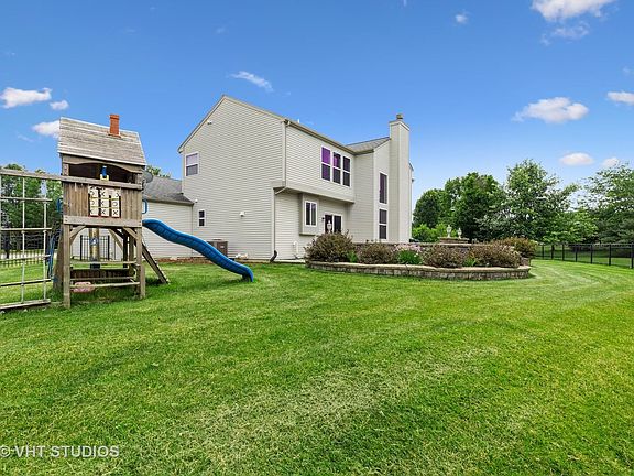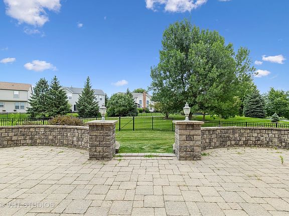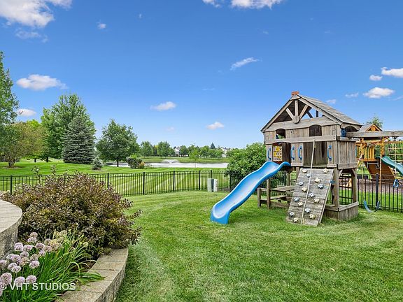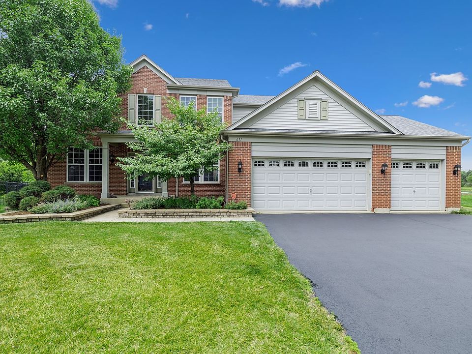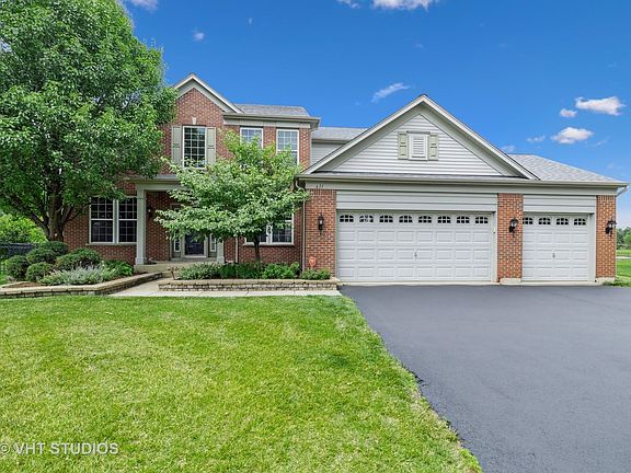 Beautiful, open concept Sterling model in Manchester Lakes. This 3-car garage, brick home with classic covered front porch, is situated on a quiet cul de sac, backing to open space with views of the pond. Enjoy time outdoors with a fenced in backyard, playset and professionally designed brick paver patio. Two story family room with gas burning fireplace, main floor den, hardwood floors, first floor laundry room, large secondary bedrooms with walk in closets. Sought after Huntley schools! Neighborhood walking paths, parks and ponds. Close to shopping and restaurants.