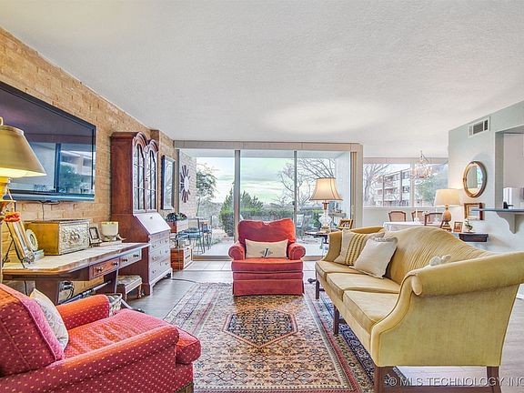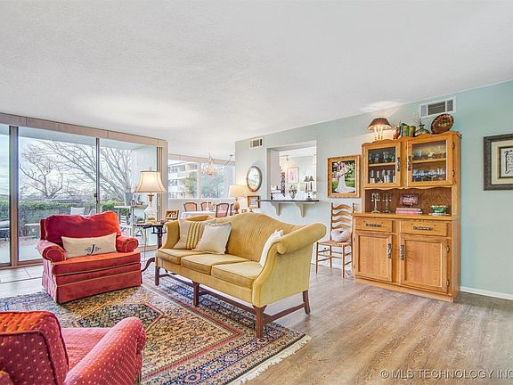 Welcome to this stunning 2-bedroom, 2-bathroom condo that perfectly blends modern upgrades with a prime location! Nestled on the ground floor, this home features wonderful views of the Arkansas River, framed by a newly installed wall of windows that fill the living room with natural light. The open-concept living room offers luxury vinyl plank flooring creating a warm and inviting atmosphere. The updated kitchen has ample cabinetry, sleek granite countertops, and stainless steel appliances. Both bedrooms are spacious bedrooms with generous closet storage. The primary suite features an updated bathroom with stylish fixtures and finishes. This condo is perfect for those seeking a lock-and-leave lifestyle, with easy access to Downtown Tulsa, Cherry Street, and a variety of dining, shopping, and entertainment options.