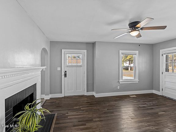 Charming renovated 3-bedroom, 1-bathroom home just a few blocks from the heart of downtown New Bern, NC. This cozy residence boasts fresh updates throughout, including new LVP flooring, fresh paint, and there are beautiful arched doorways that add character and charm. The spacious living room features a brick gas fireplace, creating a warm and inviting atmosphere. To the right, you'll find an eat-in kitchen complete with tile flooring, white cabinetry, sleek subway tile backsplash, stainless steel appliances, and recessed lighting, perfect for both cooking and entertaining. The home offers three bedrooms, with two featuring matching LVP flooring, while the third is carpeted for added comfort. The fully renovated bathroom includes modern subway tile, a white vanity, and a bath/shower combo. Enjoy the outdoors on the screened-in back porch, which leads to a fenced-in backyard with a shed for extra storage. With its proximity to downtown New Bern and numerous updates, this home is the perfect blend of comfort and convenience!