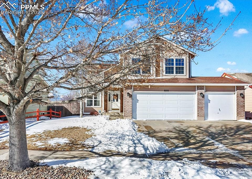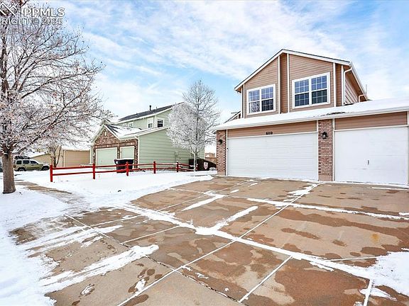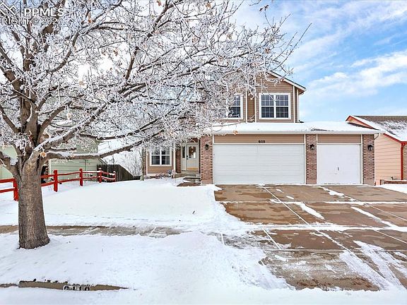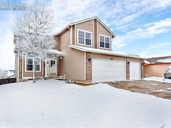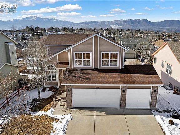 Excellent Front Range and Pikes Peak Views! Four bed, four bath, three car, two story home with a walk-out basement, over 2,800 sq ft! Stainless appliances, new microwave and dishwasher, refrigerator included. Luxury vinyl flooring in the kitchen, and bathrooms. Main level living and family rooms with updated carpet. Two gas fireplaces, one in the mail level family room and one in the upper primary suite. The large upper level primary suite boasts vaulted ceiling, gas fireplace, attached five piece bath and a walk-in-closet. Two more secondary bedrooms on this level along with a full bath. Huge family room located in the walk-out basement, kitchenette/wet bar, a secondary bedroom and a three quarter bath. Centrally located, close to open spaces and easy access to shopping, Woodman Road and the Powers Corridor.