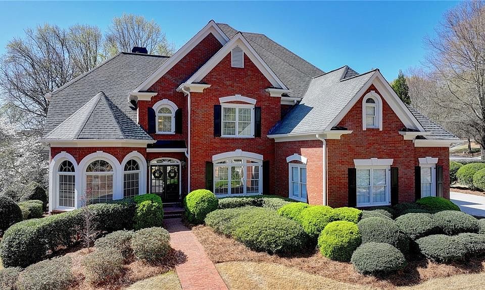 Stunning 5 bed/5 bath 4 side BRICK HOME with professionally FINISHED TERRACE LEVEL with GUEST BEDROOM ON THE MAIN and CIRCULAR DRIVEWAY on an almost HALF ACRE immaculately landscaped lot! HARDWOOD FLOORS were just REFINISHED! EXTERIOR PAINTED IN 2023! Enter through the double front doors into the 2 story hardwood foyer. To your right is the family-sized dining room with crown and picture frame molding and hardwood floor. To your left is an elegant office with French doors, bayed window, crown molding and hardwood floor. The grand 2 story family room features a beautiful stack stone fireplace, soaring floor to ceiling windows, custom cabinetry and door to the deck. The gourmet kitchen is perfect for the family chef and features custom cabinetry, granite countertops, a large kitchen island, stainless steel appliances, gas cooktop, double oven, custom tile backsplash, walk-in pantry and light, bright bayed breakfast room with door to the expansive deck and views of the tranquil, wooded, private lot. MAIN FLOOR GUEST BEDROOM with full bathroom with tile floor and shower. A convenient laundry room with sink completes the main floor. Upstairs, the romantic master suite features a cozy sitting room with marble fireplace, custom cabinetry, vaulted ceiling and opulent spa bath with double vanity, tile floor and shower, soaking tub, vaulted ceiling and HUGE WALK-IN CLOSET which has room for an office/reading area. 2 large bedrooms, each with a full en-suite bathroom with tile floor and shower complete the upper level. The professionally finished terrace level has room for everyone and features a huge living/family room with stain-grade custom cabinetry and tray ceiling, a large game room with sitting area, wet bar, office/craft room with tray ceiling, bedroom and full bathroom with tile floor and shower, and exercise room with door to the backyard. Step out through French doors onto the patio and large, level, manicured backyard with gorgeous flowering trees! This home has been lovingly maintained by the original owners! All of this and more and situated in Forsyth County's premier golf/swim/tennis community in the sought-after Lambert High School district. Welcome home...