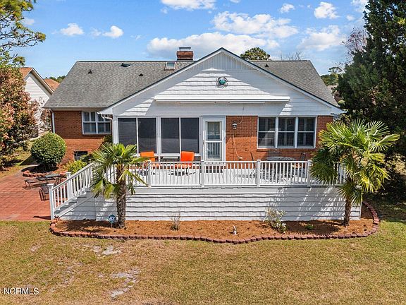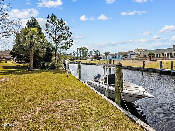 Waterfront brick home is spacious, updated, and immaculate. The boat slip will accommodate most boats with tie poles extended out from the bulkhead. Take a boat ride to New Bern or Oriental for lunch or just enjoy cruising in the Inner Harbour, Northwest Creek, the Neuse River, ICW and all points beyond. In the home, the windows are adorned with plantation shutters and wood flooring covers most of the living areas. The skylight brightened living area has warm wood flooring, a fireplace complete with built-ins, and has plenty of room for family and friends. It opens to the Carolina Room with walls of windows, attractive tile flooring, and water views. The kitchen has been updated with granite countertops and stainless appliances. Much of the white cabinetry has glass doors and there is a cabinet pantry. A breakfast bar separates the kitchen from the breakfast nook and has water views. The dining area has chair rail and crown molding. The spacious master bedroom is separated from the other bedrooms and has an updated private bath, walk-in shower, and walk-in closet. The guest rooms flank the guest bath on the other side of the living areas. The laundry room is huge and walks down to an office/flex room. The oversized 2 car garage has cabinets and walkup storage. The front porch is covered and welcoming. Enjoy alfresco dining on the spacious deck with retractable awning, or the lower patio. The gated neighborhood offers marinas, boat ramp, kayak launch, 18 hole golf course, restaurant, swimming, acres of walking/biking paths, tennis, pickle ball, parks, dog park, community center, activity rooms, lots of clubs and activities, and optional rec center you can join with equipment rooms, indoor and outdoor pools, exercise classes, and mini golf course.