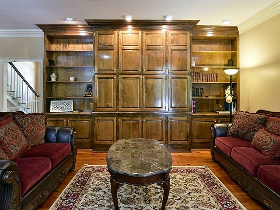 - Interior: Kitchen Island, Built-in Bookcases, Crown Moulding, Wide Baseboard
