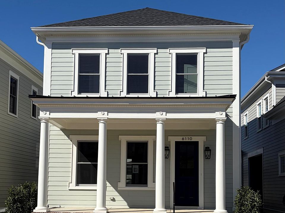 Welcome to the Hillsdale plan by The Ramage Company—a timeless blend of classic vernacular design and modern functionality. This thoughtfully crafted home offers exceptional curb appeal and a flexible floor plan designed to accommodate a variety of lifestyles. With inviting covered porches at both the front and rear, plus a spacious, private courtyard nestled between the home and detached garage, outdoor living is seamlessly integrated into everyday life. Inside, the first floor features an open-concept layout with a functional kitchen, walk-in pantry, and a mudroom complete with custom built-in cubbies. Upstairs, the primary suite offers a spa-like retreat with a generous walk-in closet, while two additional bedrooms share a Jack and Jill bath. A full laundry room completes the second floor. Ideally situated near the North Village Town Center and local parks, the Hillsdale plan is a perfect blend of comfort, charm, and convenience.
