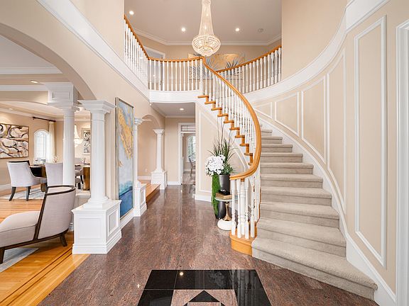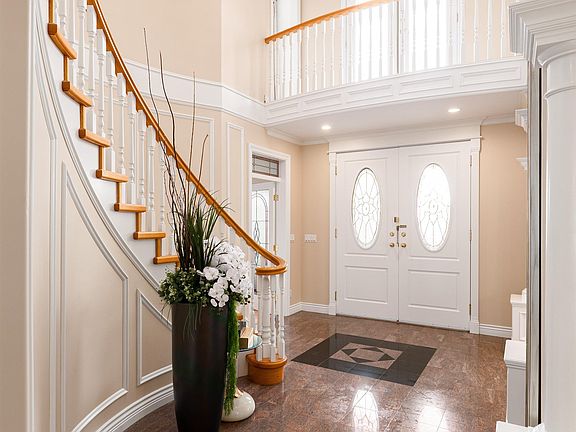 Expensive tile floorTasteful moulding workCurved stairwayOffice on main floor