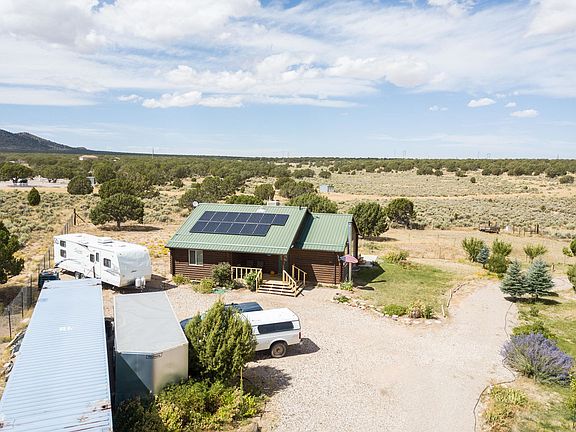 Cozy log cabin out in the country that has the potential to be off grid. Solar panels & private well with 1 AFW, beautiful views, fully fenced, fruit trees & bushes, large container for storage, RV parking & hookups, fenced garden area, metal roof, covered front deck, and pellet stove in basement.