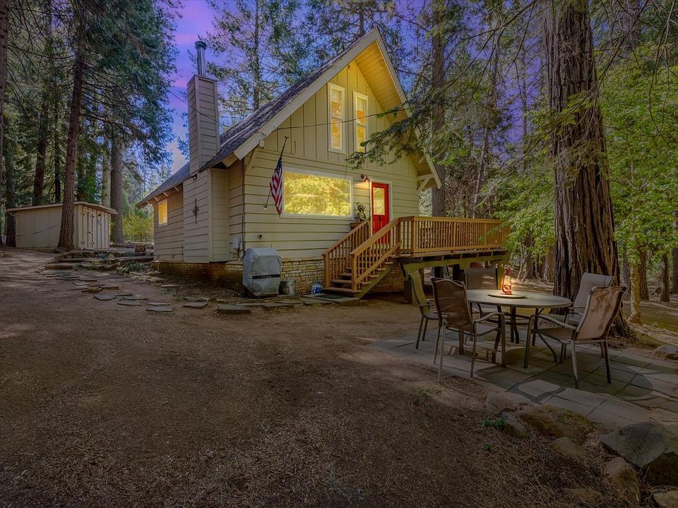 Why settle for ordinary when you can own this FULLY FURNISHED cabin-style retreat in Pollock Pines? Move right in and start enjoying your own little piece of heaven just minutes from Jenkinson Lake. This charming home radiates pride of ownership, with no detail overlooked. Cute, updated kitchen boasts granite counters and a removable center island. Living room features a large picture window framing the nature filled views, and cozy fireplace. One bedroom and full bath downstairs. Upstairs are 2 bedrooms, half bath, and a private balcony overlooking the property views. Outside the park-like acre is a nature lovers dream. This fully fenced property features apple trees & ample room for a garden. The outdoor deck and patio area is complete with seating, axe-throwing target, firepit, hammock & more. Whether you're gathering with friends around the fire or enjoying peaceful moments in the hammock, this outdoor space is sure to become a favorite. Detached 2-car garage, and an outbuilding that serves as an insulated laundry & extra storage could be a small workshop. With gated entrance for privacy, this fully furnished home is perfect for a second home getaway, or first-time homebuyers. Simply move in and start enjoying the peaceful lifestyle this one-of-a-kind property offers!