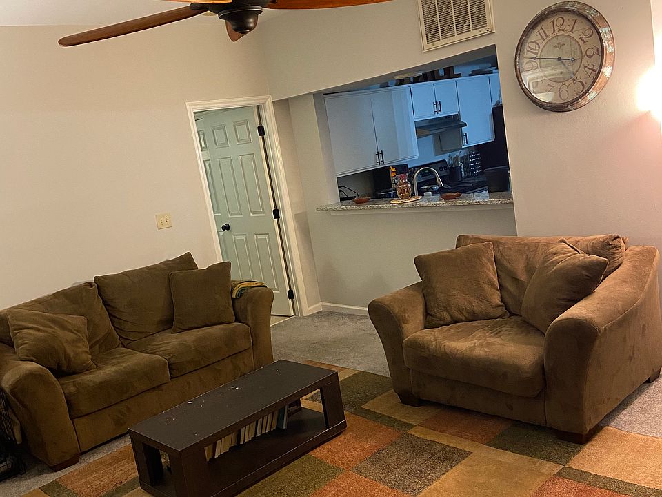 This is a private bedroom and bathroom with a shared kitchen and living room. The room is FULLY furnished. 3 minutes from I-40 and near a lot of shopping. There is a couple in the other room with two dogs that are shown in photos. The couple mostly keeps to themselves. There's access to a pool during summer. The lease is negotiable- 5-6 months would be ideal but can chat about a different range.